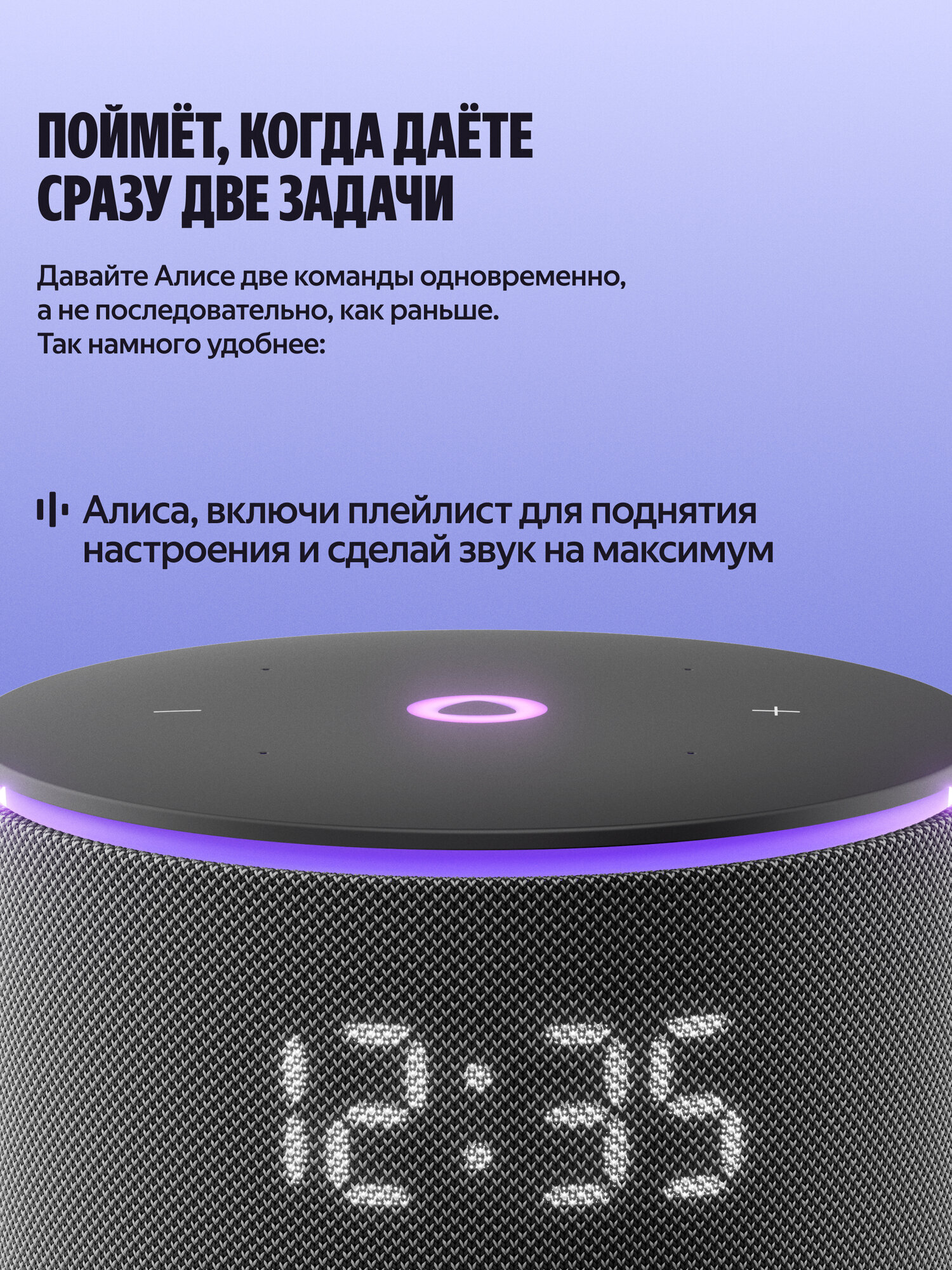 Алиса с искусственным интеллектом в Станции Мини 3 Про умеет так много: она найдёт и включит, что попросите — музыку, аудиокниги, подкасты — и подберёт рекомендации по вашим интересам. Задавайте самые разные вопросы и получайте понятные и подробные ответы. Можете даже давать ей сразу несколько команд — Алиса поймёт их и выполнит, например: «Алиса, включи плейлист для поднятия настроения и сделай звук на максимум».